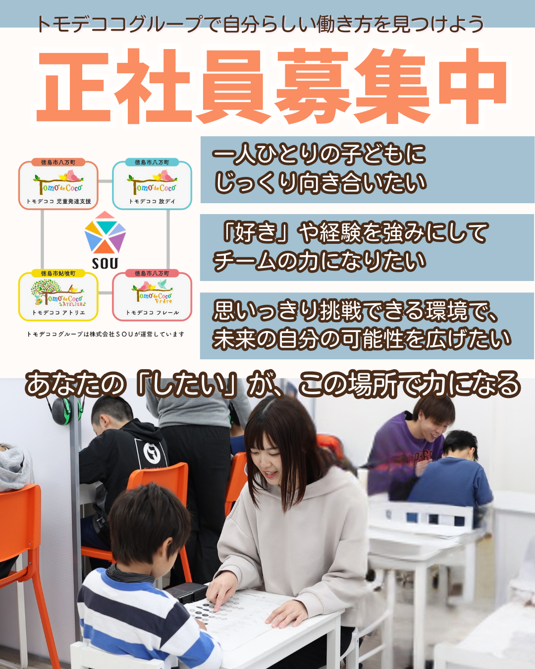株式会社SOUが運営するトモデココグループは現在4事業所ありますが、令和8年度に板野郡藍住町にも新店舗オープンを予定しています。