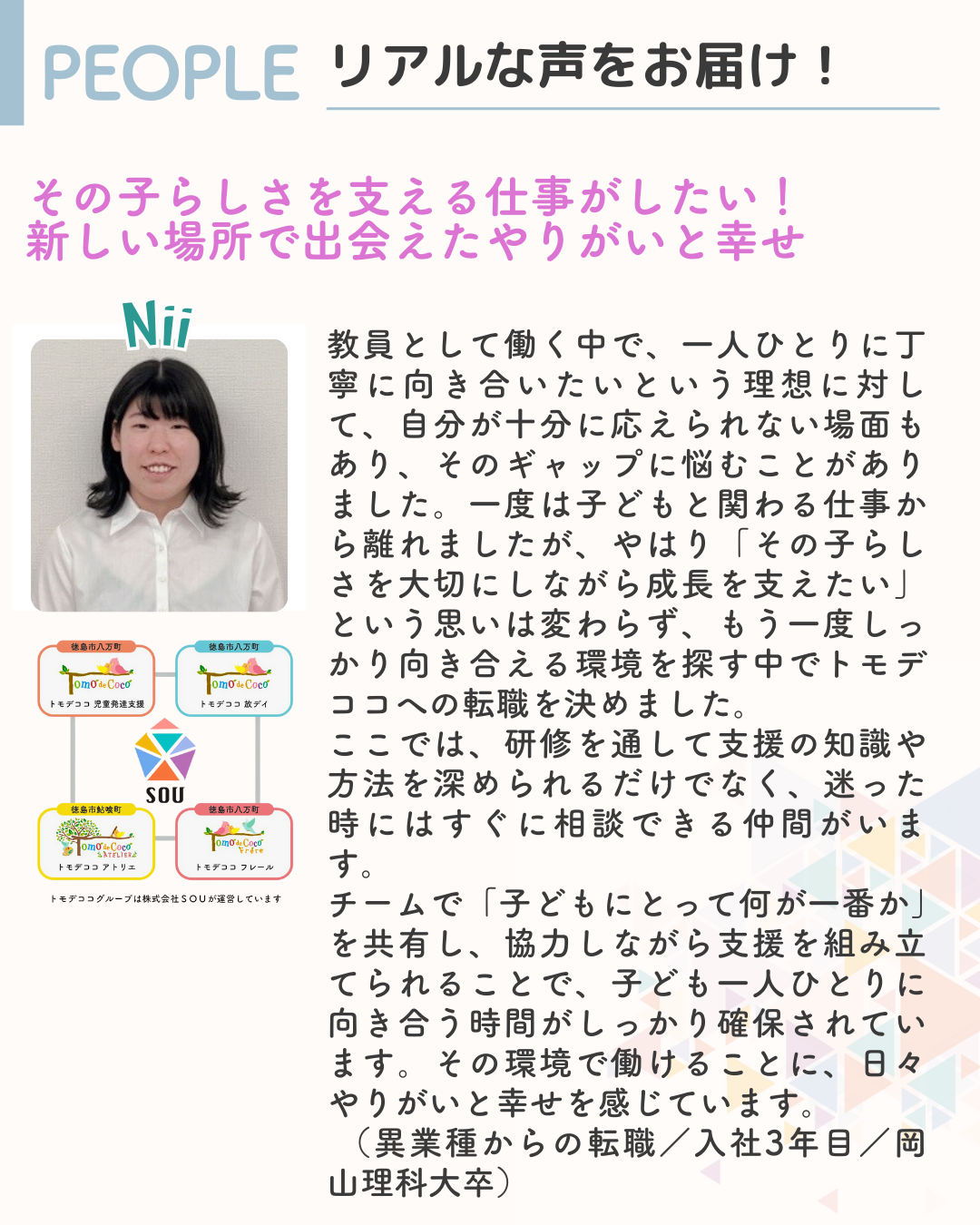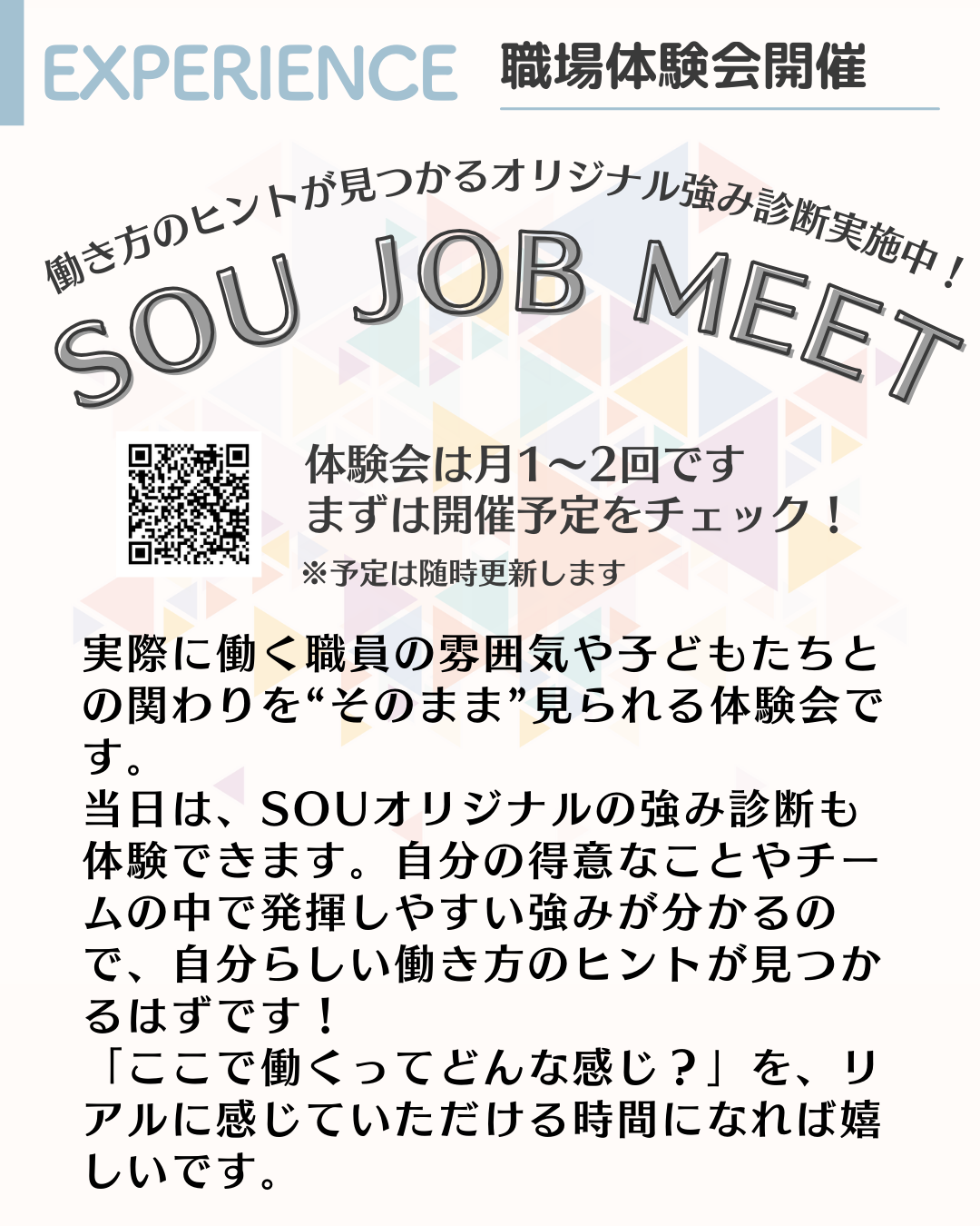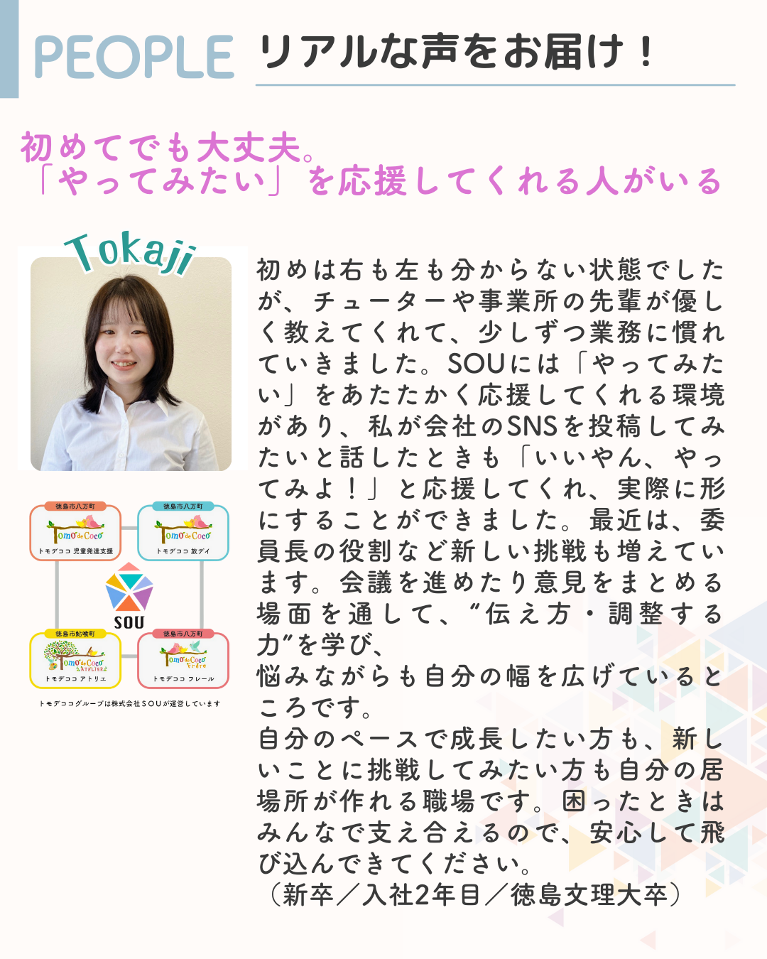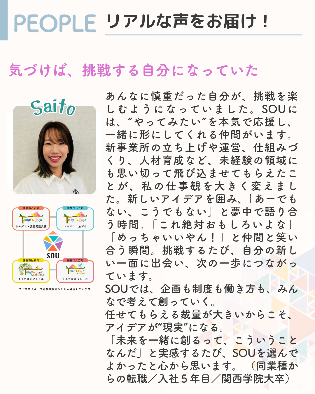「SOUで働くってどんな感じ?」「トモデココグループでなにができる?」をリアルに感じてもらえる時間です。
