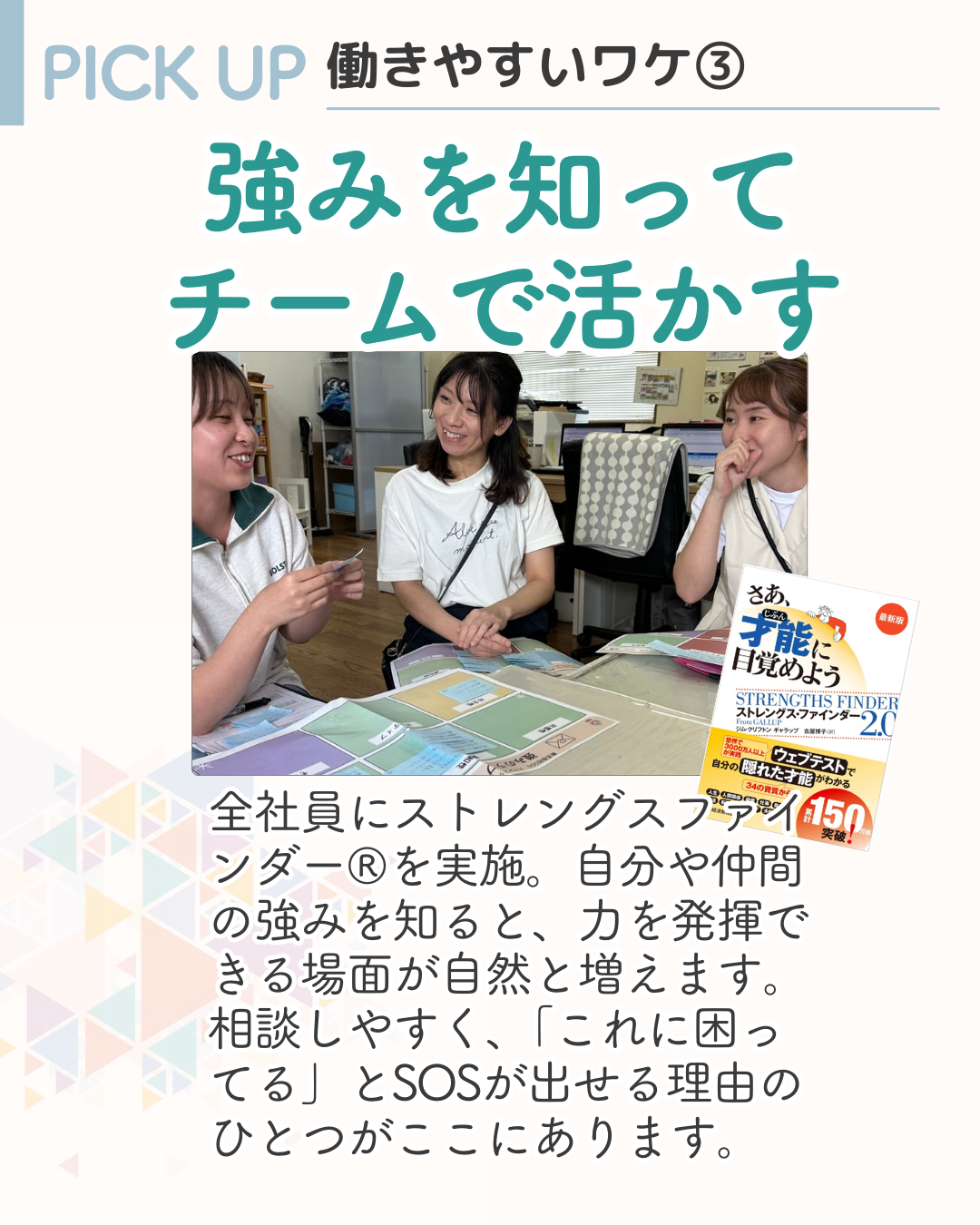 体験会当日は、SOUオリジナルの強み診断も体験できます。自分の得意なことやチームの中で発揮しやすい強みが分かるので、自分らしい働き方のヒントが見つかるはず!
