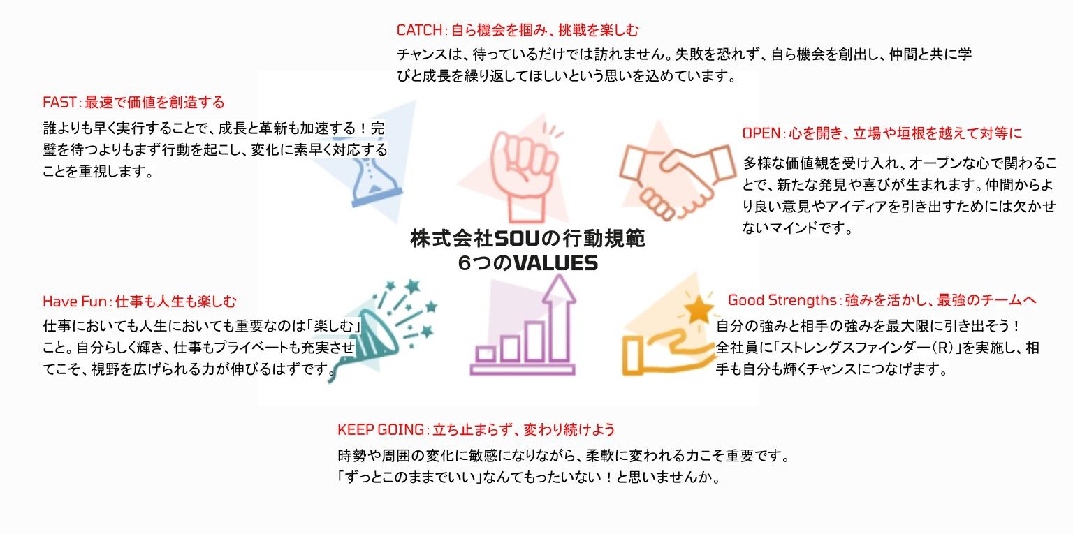 トモデココグループを運営する株式会社SOUでは「ひとを育み、社会を創る」をミッションに掲げ、6つのバリューを基盤にした行動を大切にしています。